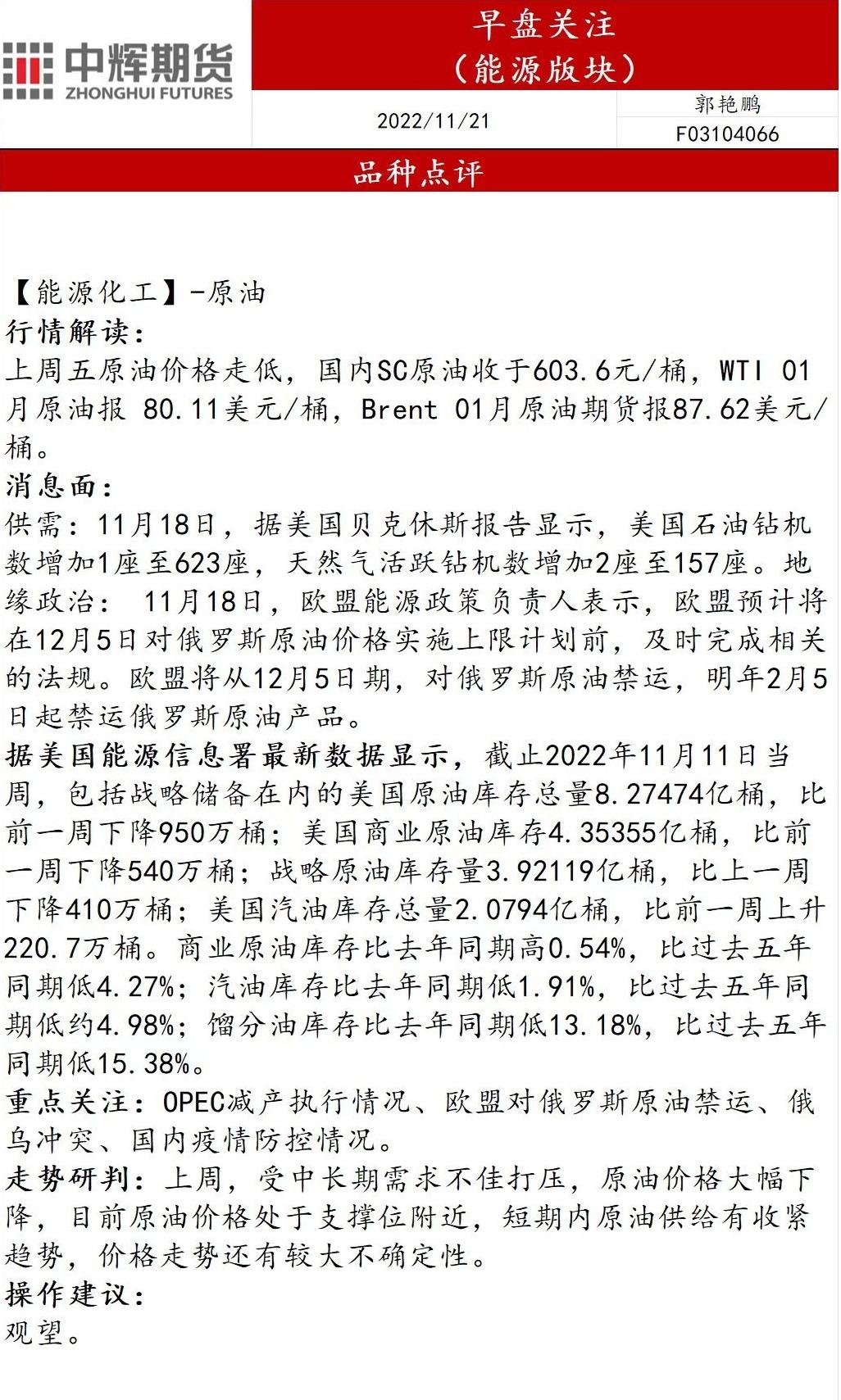 11月21日,中辉期货发布能源早盘关注,称目前原油价格处于支撑位附近,短期内原油供给有收紧趋势,价格走势还有较大不确定性。