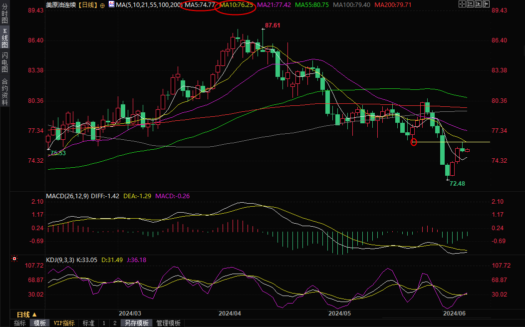 从技术面来看,日线级别,5月24日低点76.15已经转化为强阻力位所在,上周五油价反弹受阻于该位置附近,需要提防油价重回跌势的可能性,5日均线支撑在74.77附近,如果失守该支撑,则增加后市下行风险。