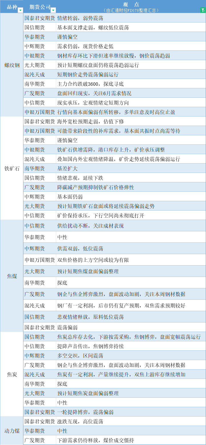 标题:期货公司观点汇总一张图:6月12日黑色系(螺纹钢、焦煤、焦炭、铁矿石、动力煤等)