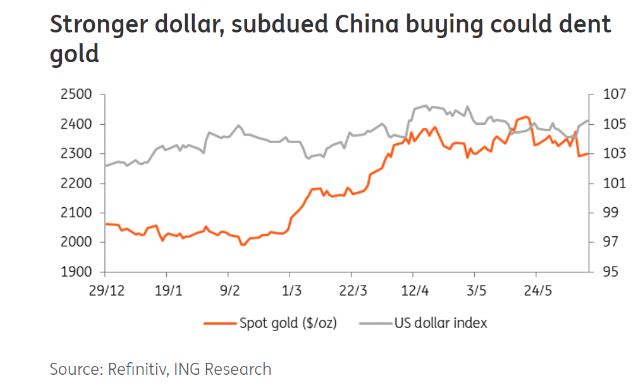 Manthey 指出,在美国公布强劲就业报告以及中国央行上月未购买黄金的消息传出后,金价已从5月份创下的2,450美元上方的新高下跌了5%。就业数据提振了美元指数,尽管中国数据拖累了金价。