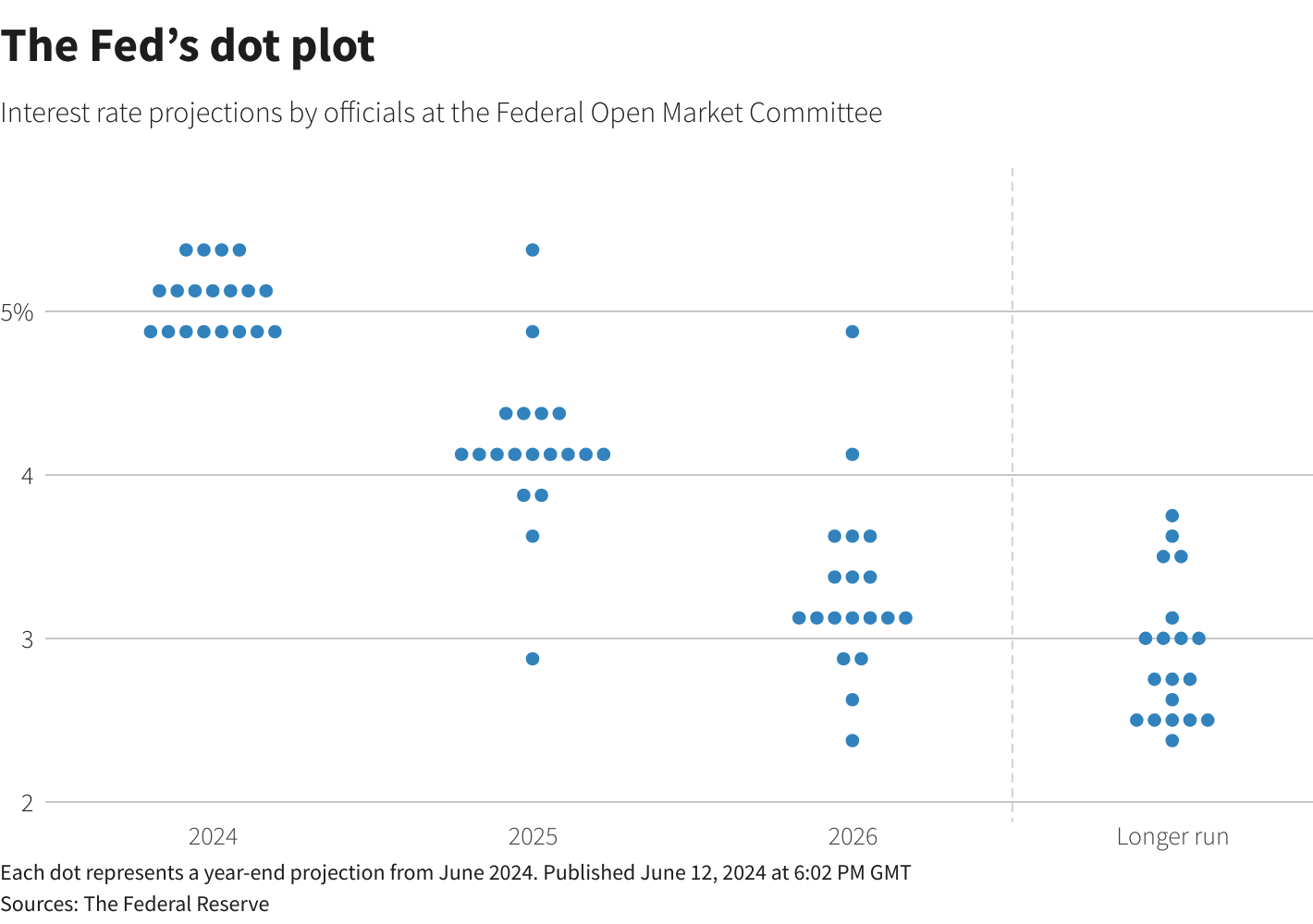 Fhn金融公司首席经济学家Chris Low表示,对于那些希望降息的人来说,点阵图告诉他们,现在对于降息过于兴奋还为时过早。5月CPI报告是一个好消息,但点阵图显示的2024年降息次数提醒我们,在美联储放心降息之前,我们需要更多像5月份那样的报告。