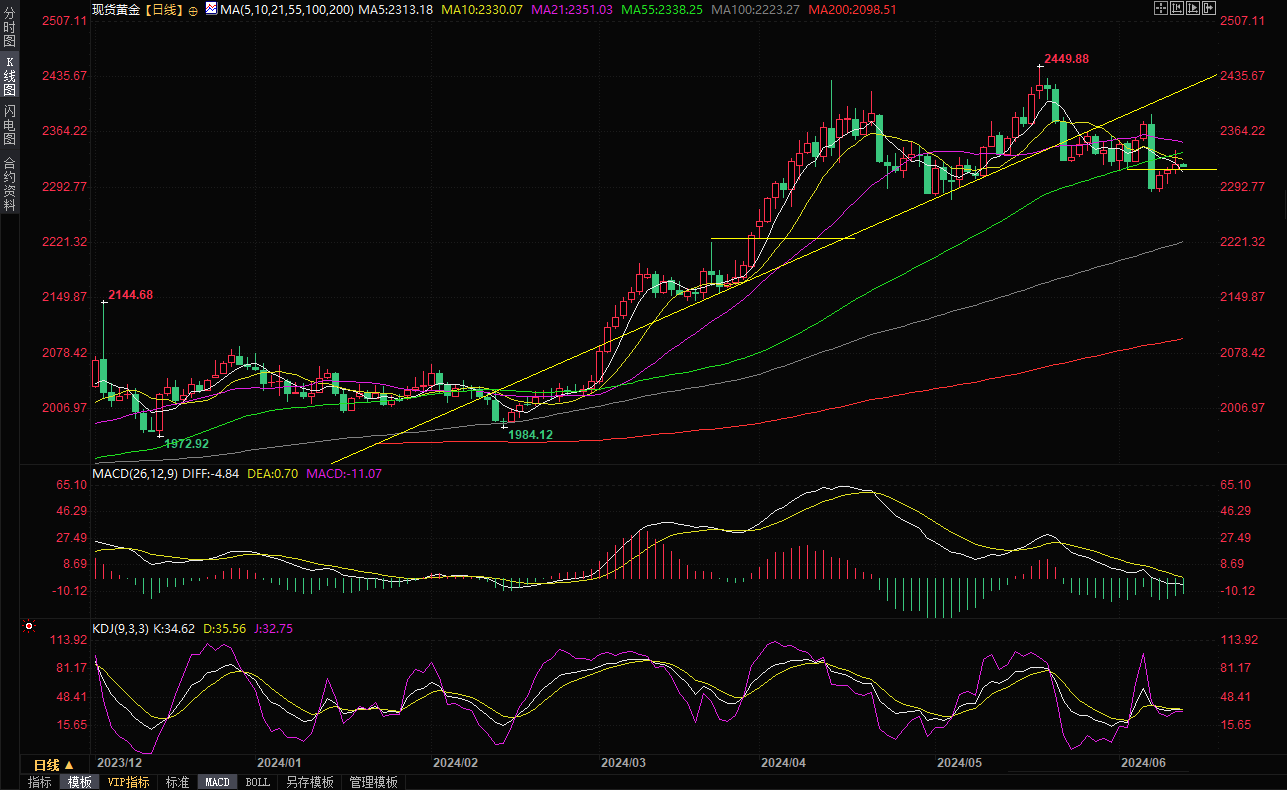 现货黄金震荡微跌,目前交投于2321.63美元/盎司附近。周三金价冲高受阻,早上时候因美国5月CPI数据显示美国通胀增速放缓,金价一度飙升近30美元至2341.51美元/盎司,但美联储利率决议维持利率不变,暗示今年将仅降息一次,美联储主席鲍威尔的讲话也不如预期的鸽派,金价回吐了大部分涨幅,收报2324.71美元/盎司,涨幅约0.35%。