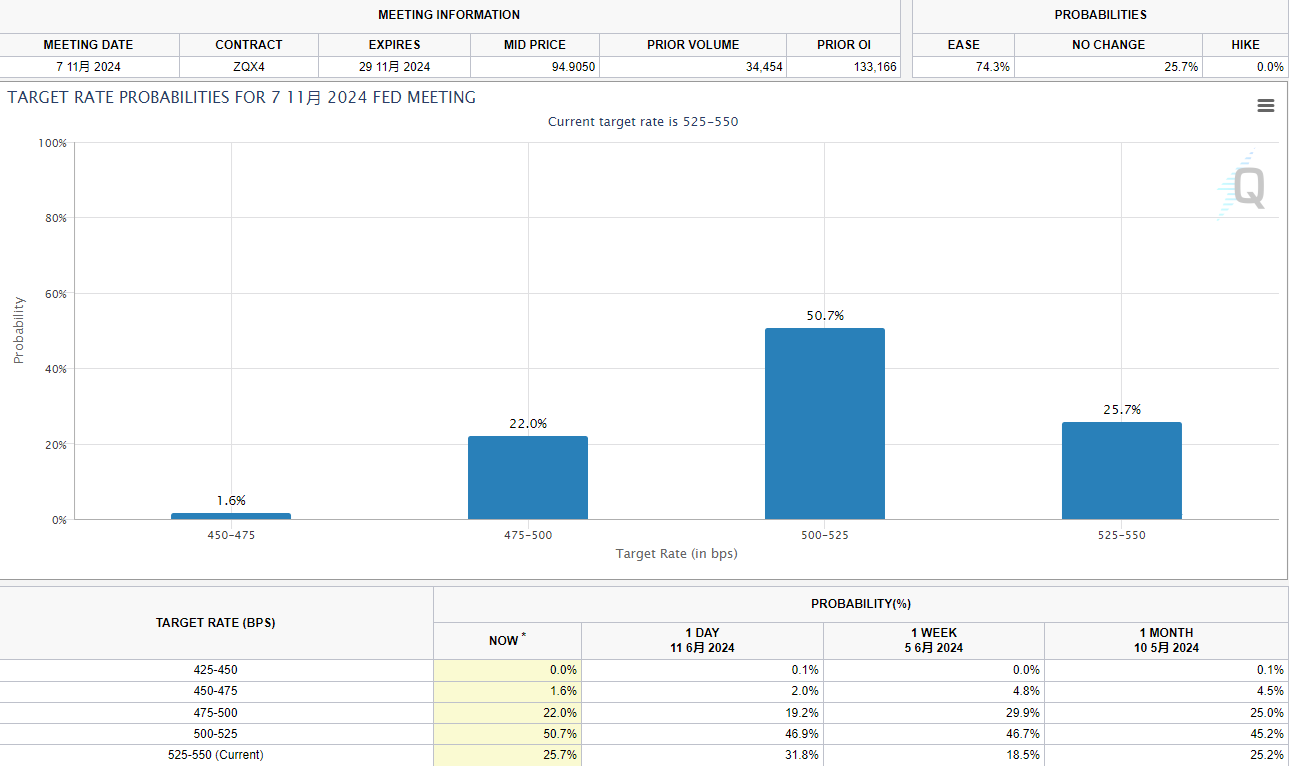 利率期货显示,美联储11月降息的概率较大,目前为74.3%,而降息25个基点、50个基点和75个基点的概率分别为50.7%、22%、1.6%,维持利率不变的概率为25.7%。