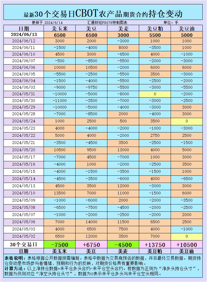 增加CBOT玉米投机性净多头;增加CBOT大豆投机性净多头;增加CBOT小麦投机性净多头;增加CBOT豆粕投机性净多头;增加CBOT豆油投机性净多头。