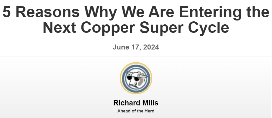 汇通财经APP讯——贵金属专家、Ahead of the Herd作者Richard Mills表示,市场即将进入下一个铜超级周期。他表示,尽管价格已达到过去五年来的最高水平,但仍有观点认为,铜和其他大宗商品从未如此被低估。一旦美联储开始降息,美元就会走弱,整个大宗商品市场就会走强。