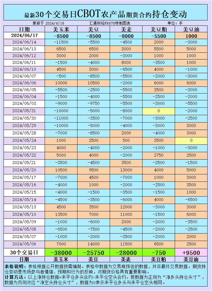 小麦市场的持仓变动尤为显著。大宗商品基金在6月17日当日以及过去30个交易日内均增加了CBOT小麦投机性净空头。这一变动与芝加哥小麦期货价格跌至两个月来的最低水平的情况相吻合,反映了市场对小麦价格短期内可能进一步下跌的预期。
