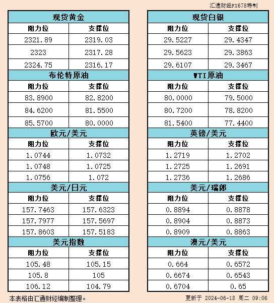 6月18日亚市支撑阻力:金银原油+美元指数等六大货币对