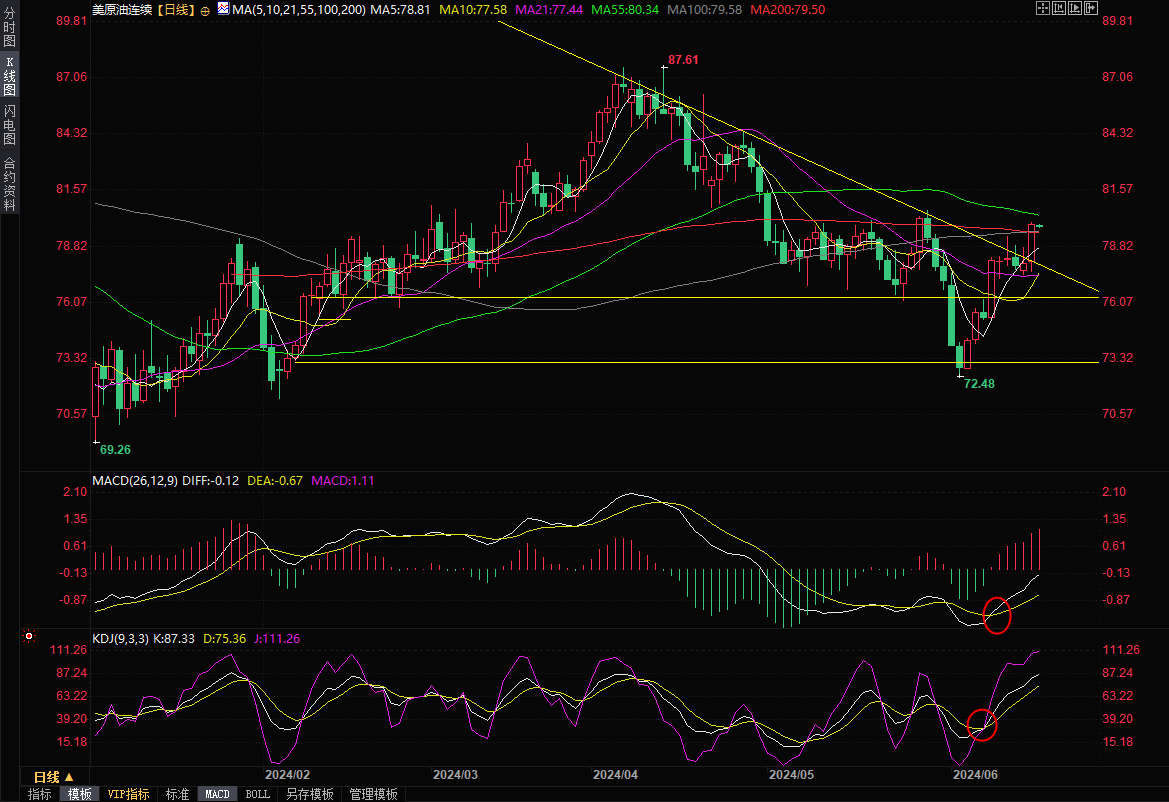技术面来看,日线级别,油价初步顶破了下行趋势线、100日均线和200日均线等多重强阻力位,短线看涨信号显著增强,若能守在200日均线79.50上方,则有望进一步顶破5月29日高点80.62附近阻力,并有望重新涨向4月份高点87.61附近位置。