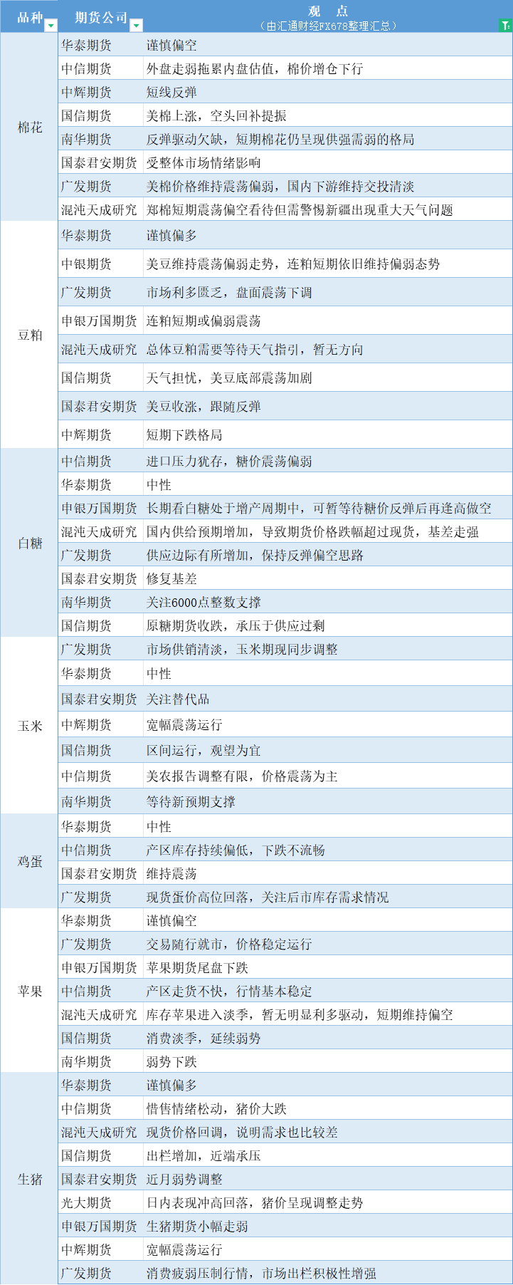 期货公司观点汇总一张图:6月19日农产品(棉花、豆粕、白糖、玉米、鸡蛋、生猪等)
