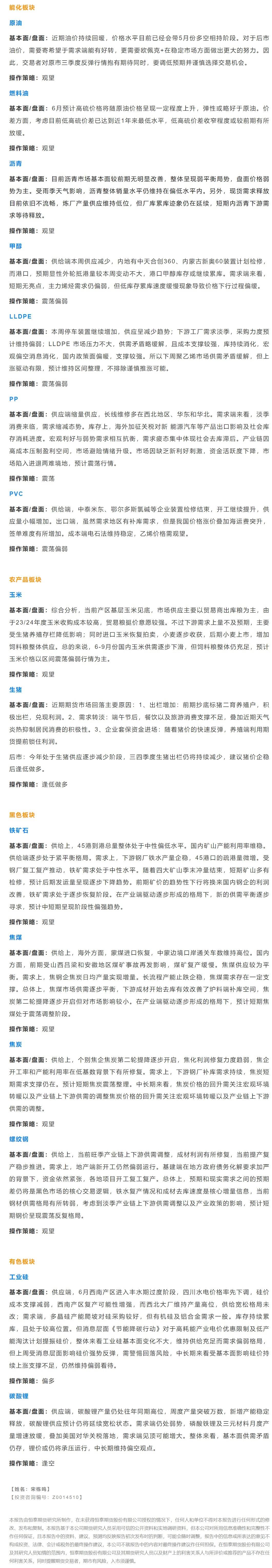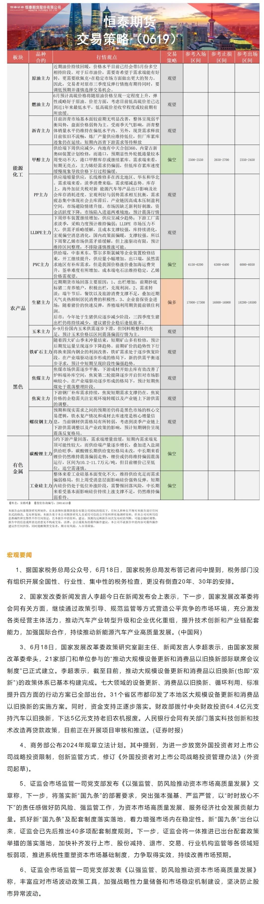 以下是恒泰期货今日早间交易策略,覆盖品种有:宏观分析、原油燃料油等能源化工、玉米生猪等农产品、黑色系如铁矿石焦煤焦炭螺纹钢、有色系如工业硅碳酸锂等。