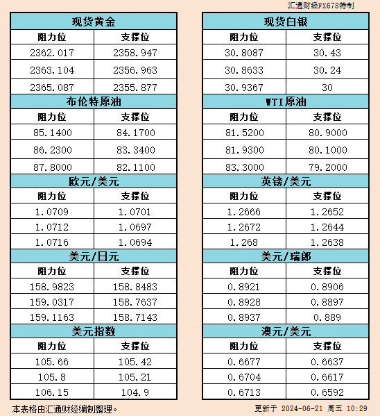6月21日亚市支撑阻力:金银原油+美元指数等六大货币对
