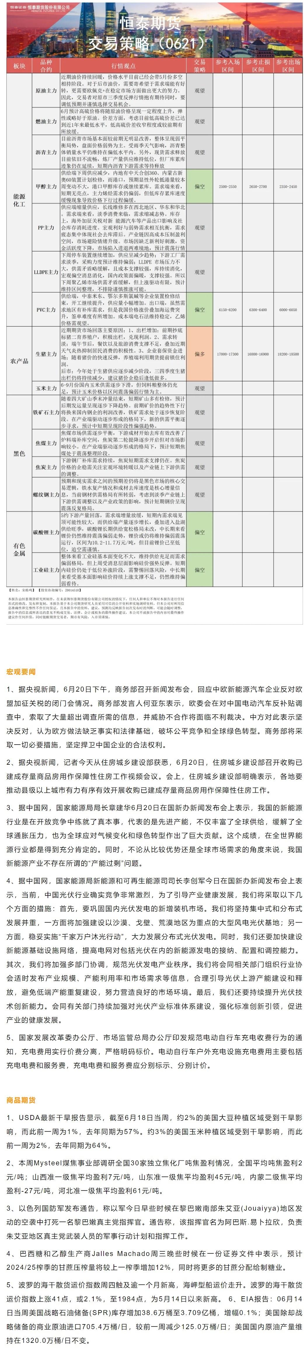 以下是恒泰期货今日早间交易策略,覆盖品种有:宏观分析、原油燃料油等能源化工、玉米生猪等农产品、黑色系如铁矿石焦煤焦炭螺纹钢、有色系如工业硅碳酸锂等。