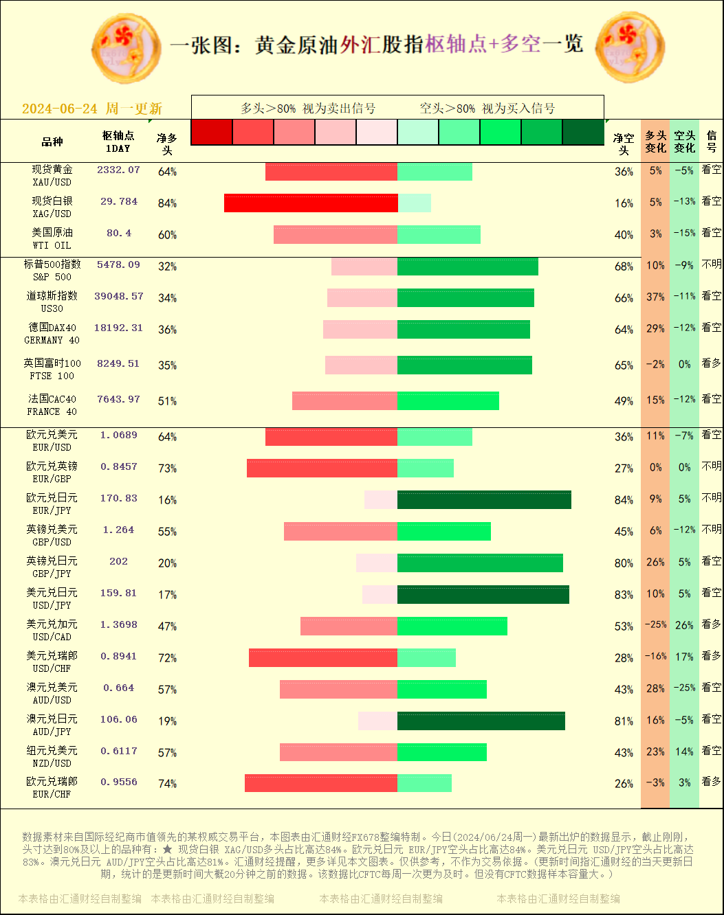 标题:一张图:2024/06/24黄金原油外汇股指"枢纽点+多空占比"一览
