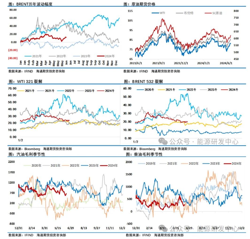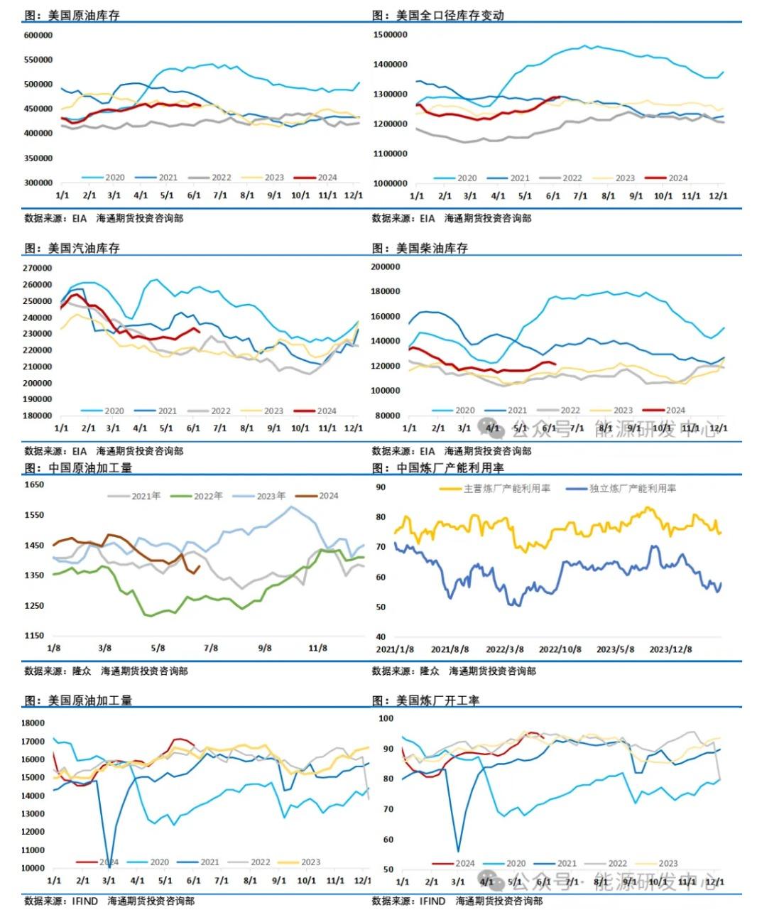 EIA报告显示06月14日当周除却战略储备的商业原油库存减少254.7万桶至4.57亿桶,汽油库存下降228万桶,精炼油库存下降172.6万桶,油品库存下降好于预期,另外数据显示美国当周成品油消费有明显反弹,接近与2023年水平,这也推动了成品油裂解利润稳定,尤其是前期一致弱于原油的美国汽油裂解差最近2个交易日开始回暖。包括高盛、荷兰国际和花旗在内的国际投行都指出了原油市场将面临供应短缺。花旗指出,由于全球原油和成品油缺口约为20万桶/天,油价将在夏季高峰期迎来看涨行情。如果仅考虑原油,则缺口更大。Kpler则认为随着夏季石油需求的增加和中东地缘政治紧张局势的加剧可能会推动