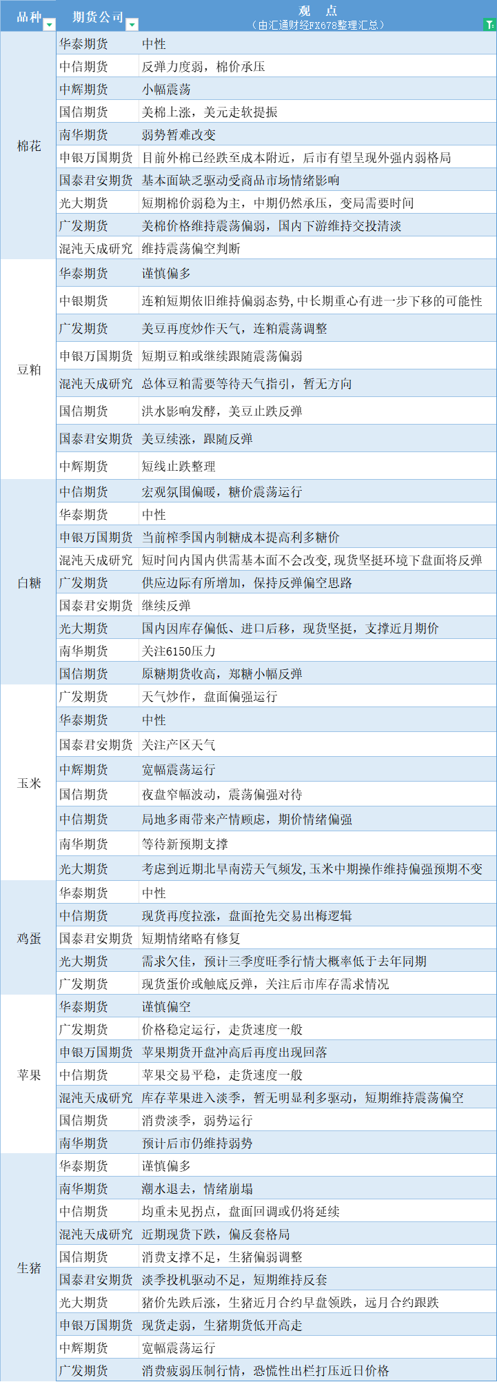 期货公司观点汇总一张图:6月25日农产品(棉花、豆粕、白糖、玉米、鸡蛋、生猪等)