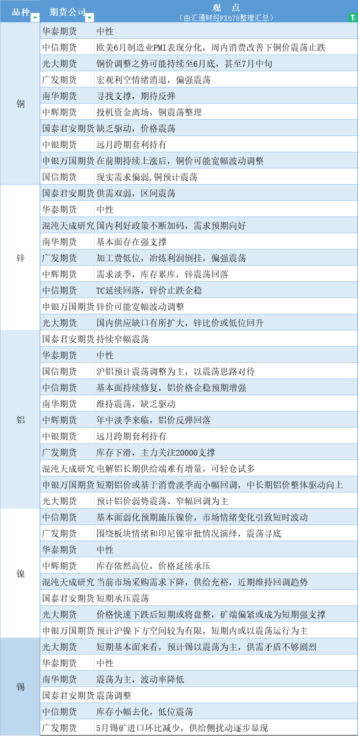 标题:期货公司观点汇总一张图:6月25日有色系(铜、锌、铝、镍、锡等)