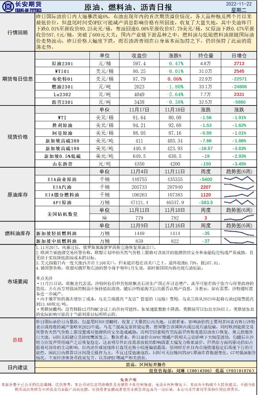 11月22日,长安期货发布原油早评,认为原油将震荡,建议区间短差操作。