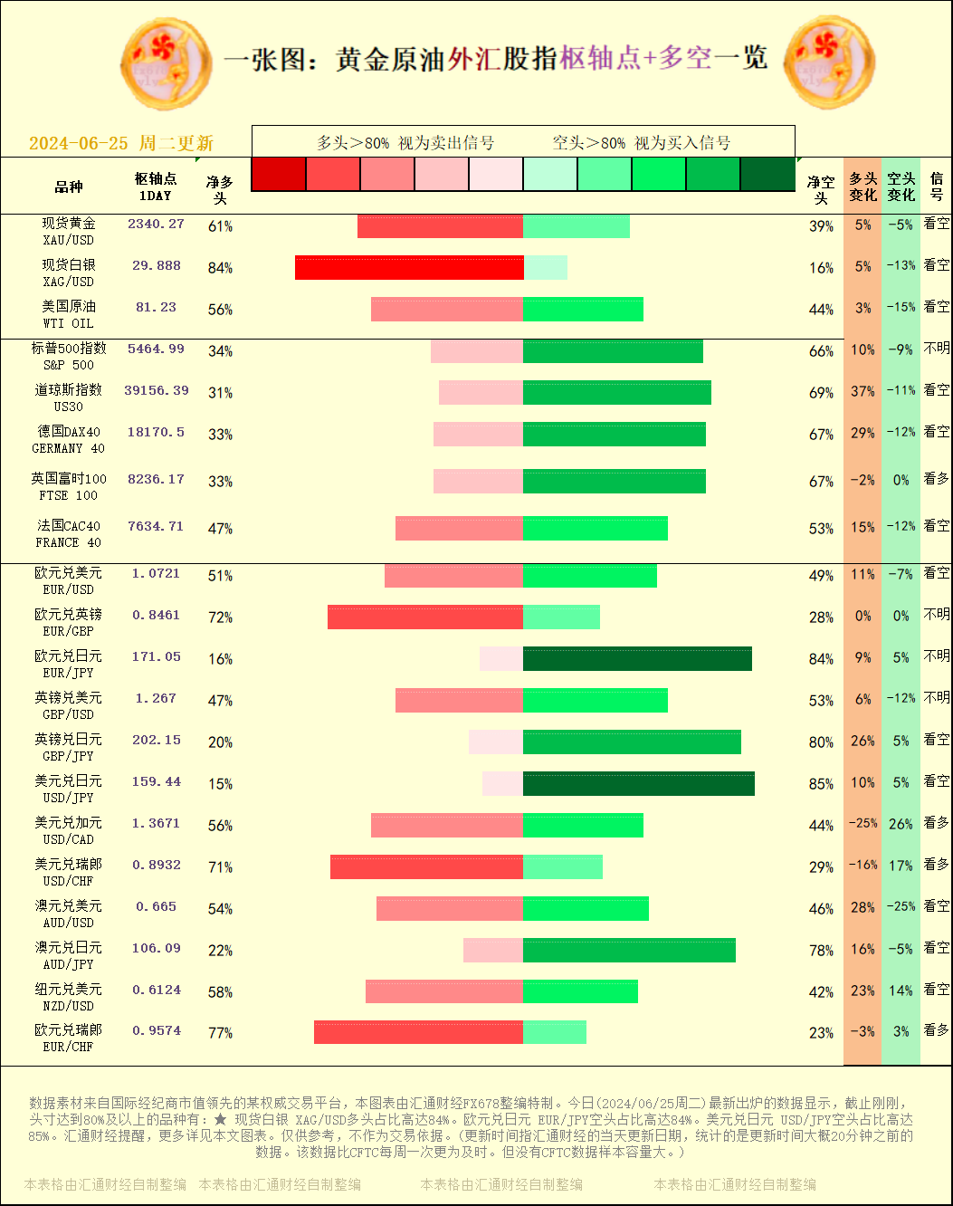 标题:一张图:2024/06/25黄金原油外汇股指"枢纽点+多空占比"一览