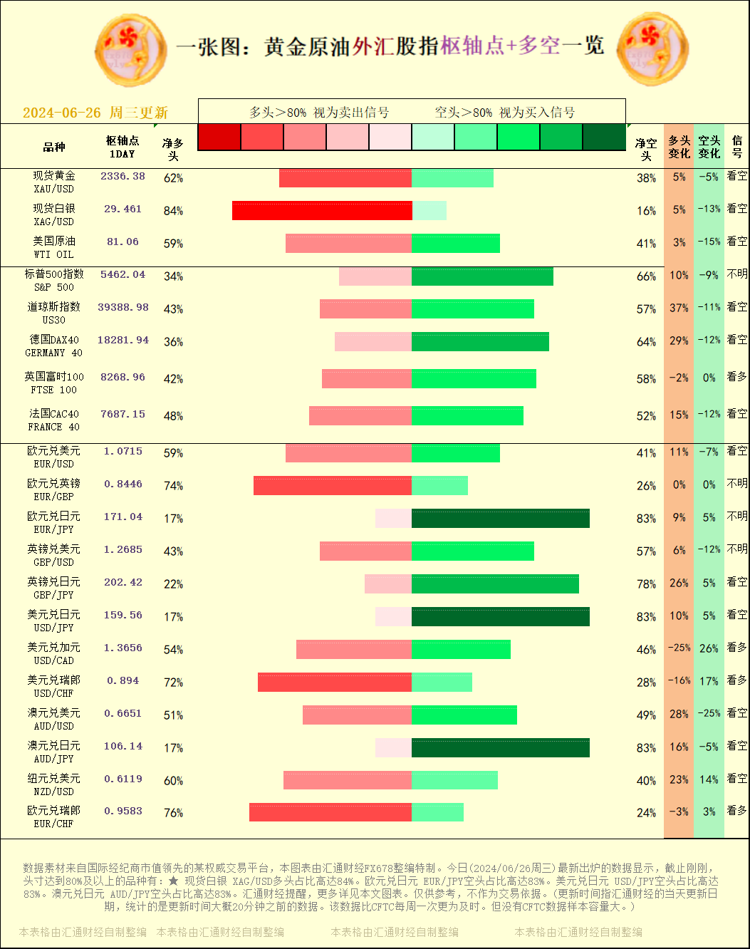 标题:一张图:2024/06/26黄金原油外汇股指"枢纽点+多空占比"一览