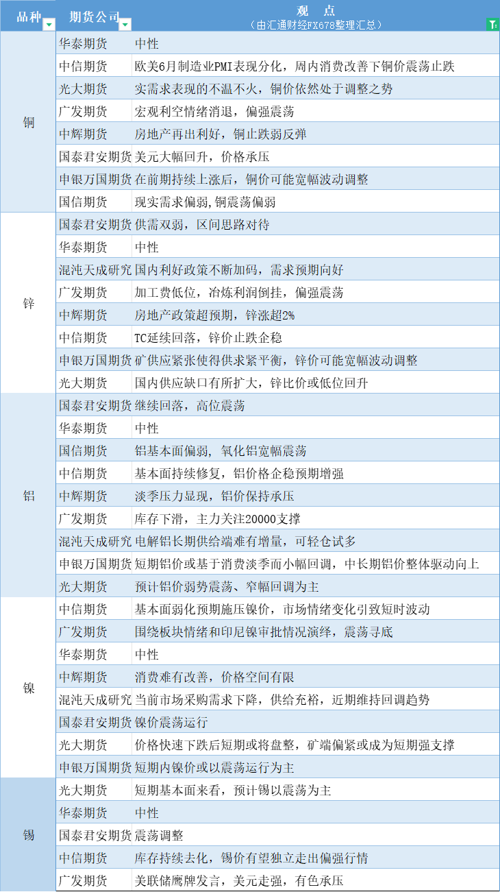 期货公司观点汇总一张图:6月27日有色系(铜、锌、铝、镍、锡等)