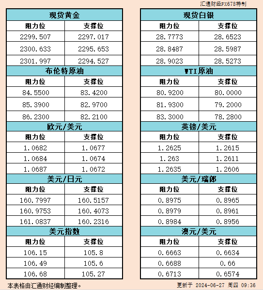 标题:6月27日亚市支撑阻力:金银原油+美元指数等六大货币对