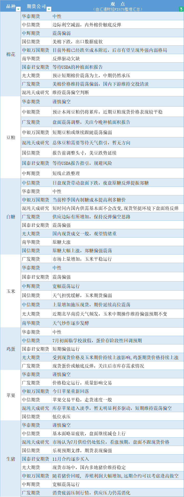 期货公司观点汇总一张图:6月28日农产品(棉花、豆粕、白糖、玉米、鸡蛋、生猪等)