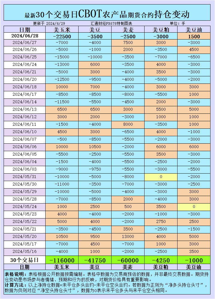 增加CBOT玉米投机性净空头;增加CBOT大豆投机性净空头;增加CBOT小麦投机性净空头;增加CBOT豆粕投机性净空头;增加CBOT豆油投机性净多头。