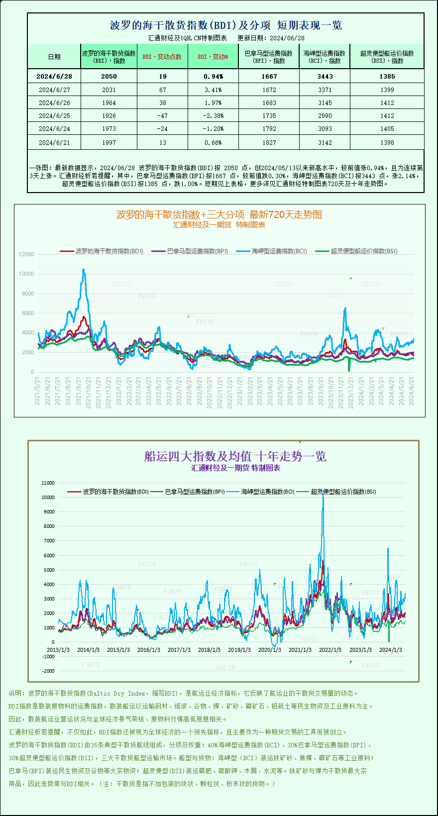 汇通财经APP讯——最新数据显示,2024/06/28波罗的海干散货指数(BDI)报2050点,创2024/05/13以来新高水平,较前值涨0.94%,且为连续第3天上涨。其中,巴拿马型运费指数(BPI)报1667点,较前值跌0.30%,海岬型运费指数(BCI)报3443点,涨2.14%,超灵便型船运价指数(BSI)报1385点,跌1.00%。波罗的海干散货指数+三大分项的最新720天走势图、十年走势图等详见汇通财经特制图表。