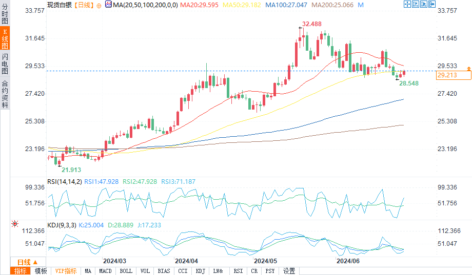现货白银在亚盘早盘触及28.748美元/盎司低位后回升,盘中报29.235美元/盎司,涨幅0.99%。