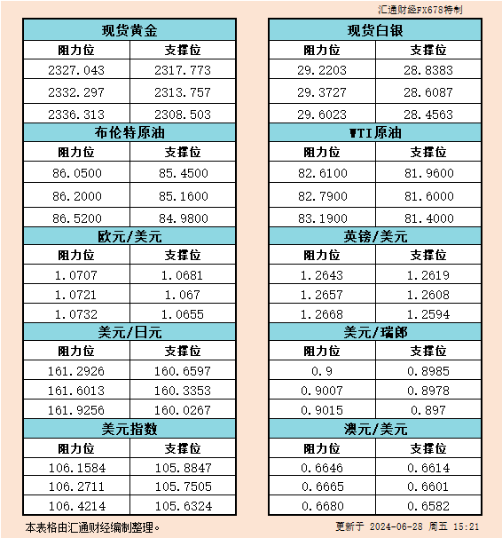 标题:6月28日欧市支撑阻力:金银原油+美元指数等六大货币对