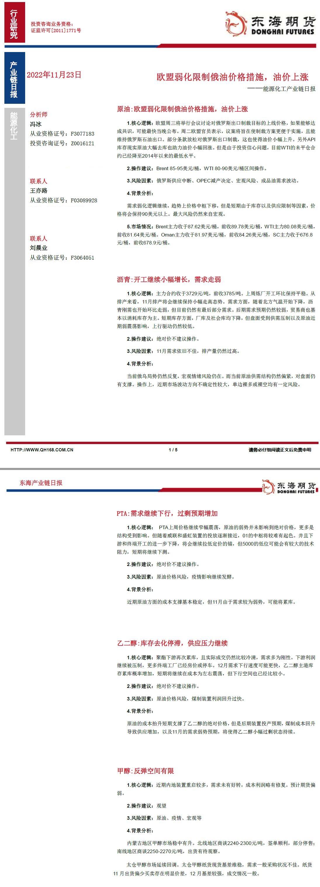 标题:【东海期货11月23日产业链日报】能化篇:欧盟弱化限制俄油价格措施,油价上涨