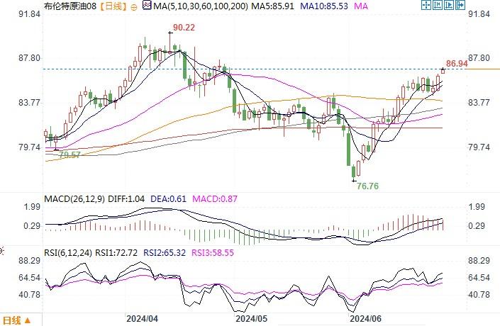 汇通财经APP讯——布油8月期货合约价格周四(6月27日)突破每桶86美元,这是因为对以色列和黎巴嫩之间爆发全面战争的担忧成为焦点,伊朗支持的伊拉克民兵誓言,如果以色列对黎巴嫩南部的真主党发动大规模行动,他们将打击美国在中东的利益。周五(6月28日)布油延续涨势,8月期货合约价格最高触及86.94美元/桶,为近两个月新高。