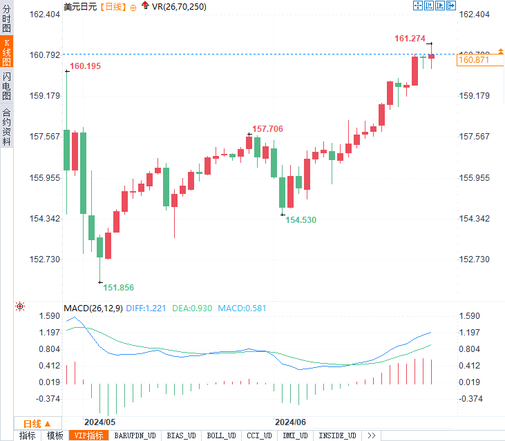 美元兑日元突破160关口,创38年新高,周五触及161.27日元,反映了市场对日本当局可能干预的担忧。