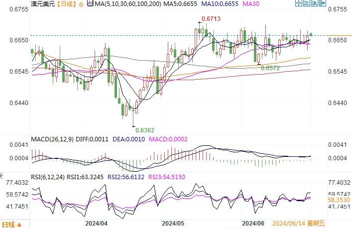 周五(6月28日),澳元/美元周五收高0.4%报0.6667,由于美国5月PCE物价指数较前月持平,叠加早些时候偏软的CPI、PPI数据,显示通胀有放缓趋势。而供应紧张导致澳洲房价持续攀升,引发通胀担忧,市场预期8月加息概率跃升至53%。两厢对比,澳元获得不小的提振。于此同时,澳元在兑日元的交叉盘中优势明显,也是助力澳元在兑美元的直盘交易中暂时站稳了脚跟,近期波动价格保持在0.66水平上方。从日线图上观察,澳元/美元整体仍未脱离区间震荡的横盘走势格局,技术指标继续呈中性,指向性仍不明朗。美联储货币政策何时转向仍是市场主要关注的焦点。因此,美元的走势仍是主导因素。预料近期若无重大消息,澳元/美元大概率仍只能继续维持着区间震荡走势,波动区间主要还是在0.66-0.6710之间。