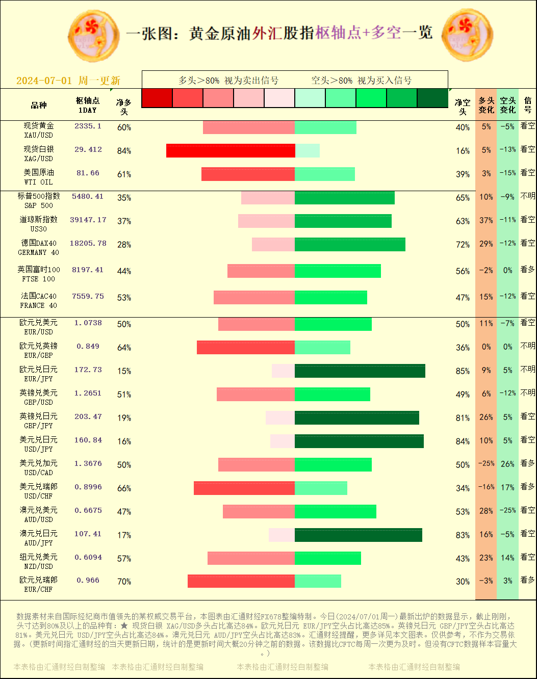 标题:一张图:2024/07/01黄金原油外汇股指"枢纽点+多空占比"一览