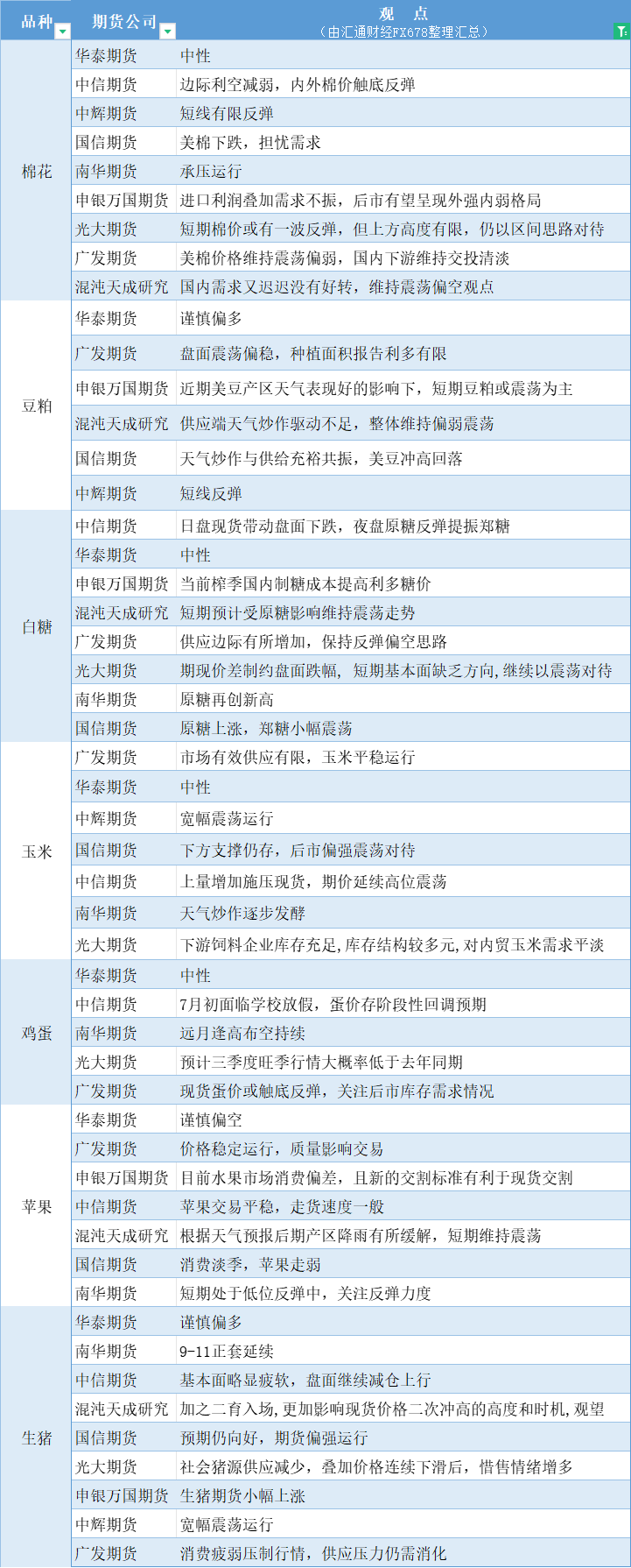 期货公司观点汇总一张图:7月3日农产品(棉花、豆粕、白糖、玉米、鸡蛋、生猪等)