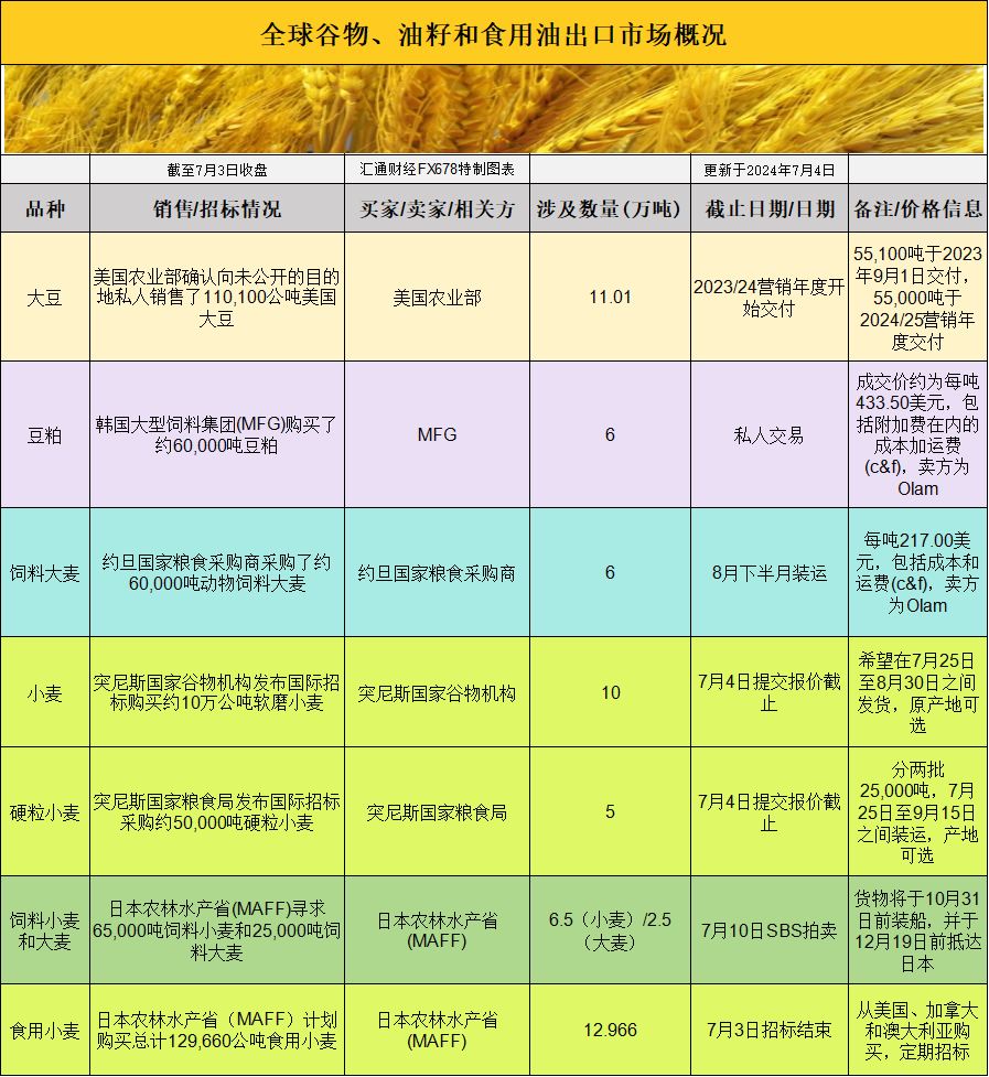 全球谷物、油籽和食用油出口市场招标、采购概况(24年7月4日):