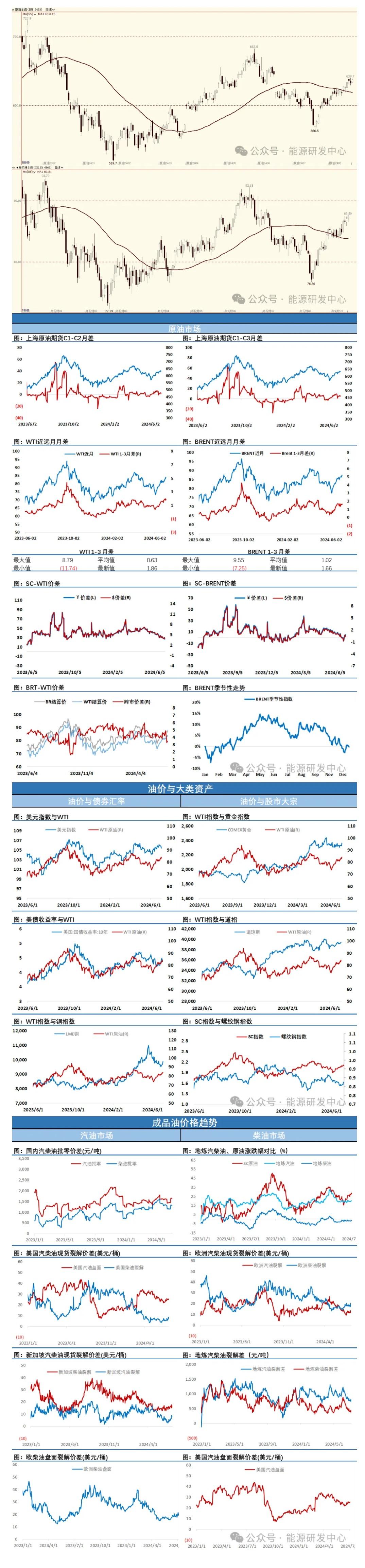 美原油期货均提前结束,成交活跃度明显下降。周一油价大幅冲高之后,本周油价重新构建了一个窄幅波动区间,地缘及飓风季吸引力市场注意力,让油价保持了强势。随着时间进入三季度除了供应端影响因素,投资者也将进一步关注消费旺季全球市场需求层面的表现,周三EIA数据显示美国成品油消费环比回升,不过在美国消费旺季阶段汽柴消费较2023年同期没有明显的增量。中国成品油市场仍延续了沉闷的氛围,价格失去活性。国内多家机构在观察了市场变化后近期发出了国内成品油消费今年提前达峰或回落的预警。柴油消费下降市场有普遍共识,汽油消费也出现了回落在国内属于首次,这是一个转折性事件。而在年度预测中,中国原油需求仍然是被列为第一大贡献增量(欧佩克240万桶增量中,70多万桶是中国贡献,目前来看这一预测已经偏离了市场太远),这也会成为下半年消费旺季面临的一大看点,一旦旺季不旺,预期继续落空,走高的油价成为堰塞湖的风险也将在此期间不断累积。