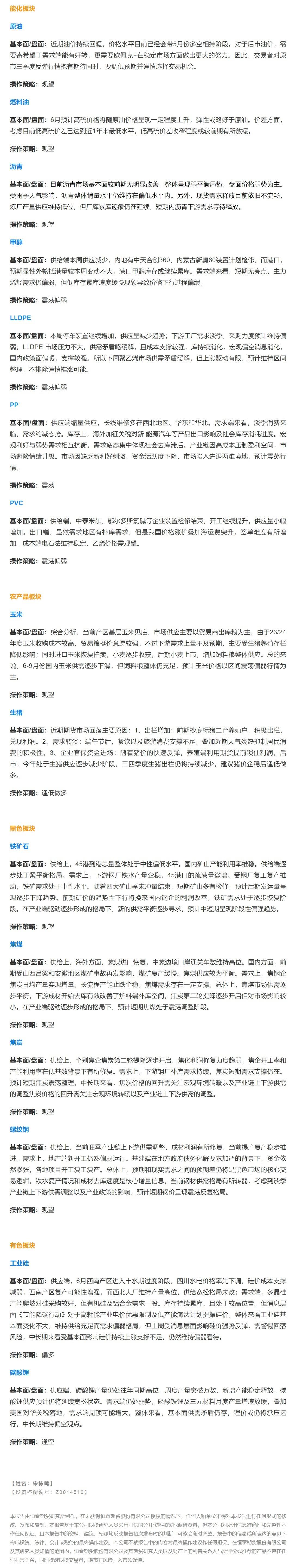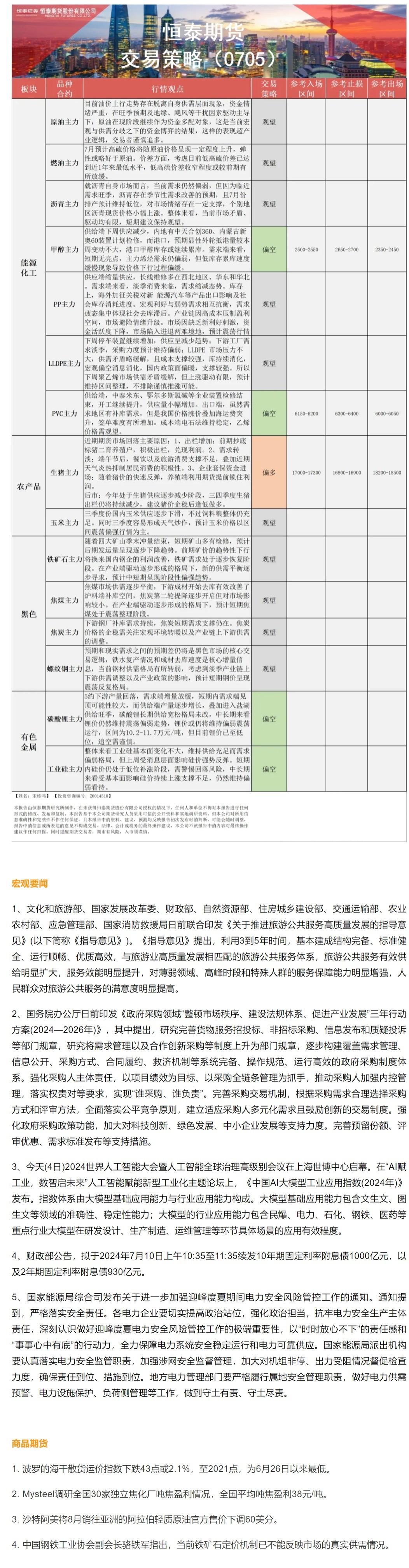 以下是恒泰期货今日早间交易策略,覆盖品种有:宏观分析、原油燃料油等能源化工、玉米生猪等农产品、黑色系如铁矿石焦煤焦炭螺纹钢、有色系如工业硅碳酸锂等。