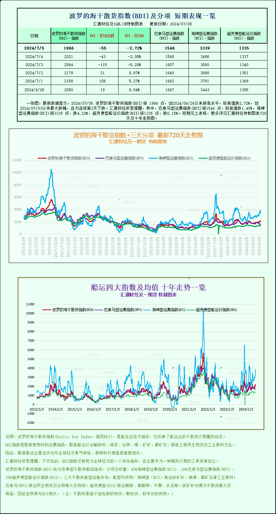 汇通财经APP讯——最新数据显示,2024/07/05波罗的海干散货指数(BDI)报1966点,创2024/06/26以来新低水平,较前值跌2.72%,创2024/07/03以来最大跌幅,且为连续第3天下跌。其中,巴拿马型运费指数(BPI)报1546点,较前值跌1.40%,海岬型运费指数(BCI)报3339点,跌4.22%,超灵便型船运价指数(BSI)报1335点,跌0.15%。波罗的海干散货指数+三大分项的最新720天走势图、十年走势图等详见汇通财经特制图表。