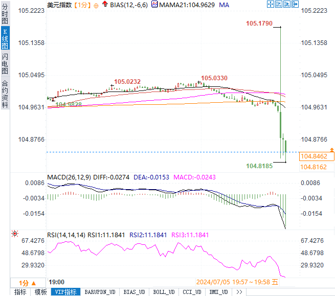 美元指数短线下挫30点,刷新6月13日新来低点,后收复此前全部跌幅,现报105.0685,日内跌幅收窄至0.06%