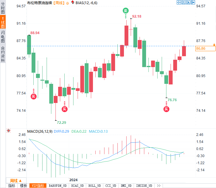 布伦特原油期货和WTI期货分别报收于每桶86.54美元和83.16美元,本周内分别上涨了0.4%和2.1%。