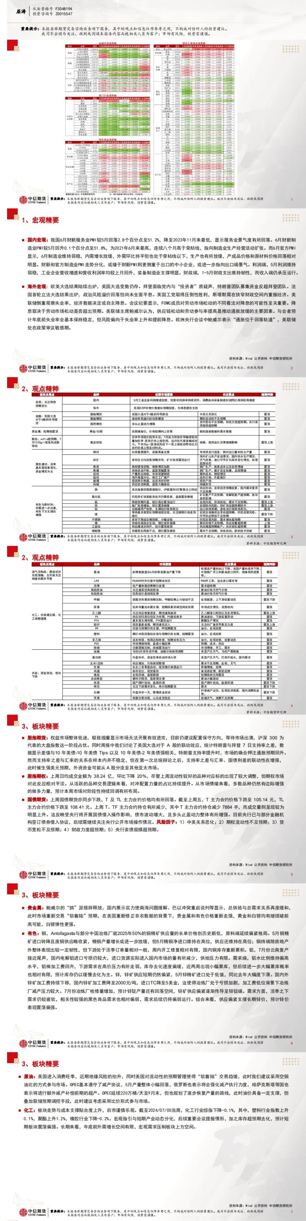 标题:中信期货7月8日晨报:地缘风险缓和重振“软着陆”预期,提振有色与贵金属