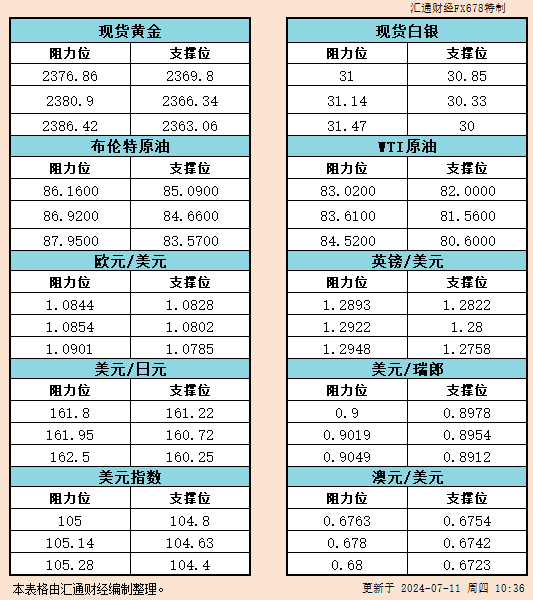 7月11日亚市支撑阻力:金银原油+美元指数等六大货币对