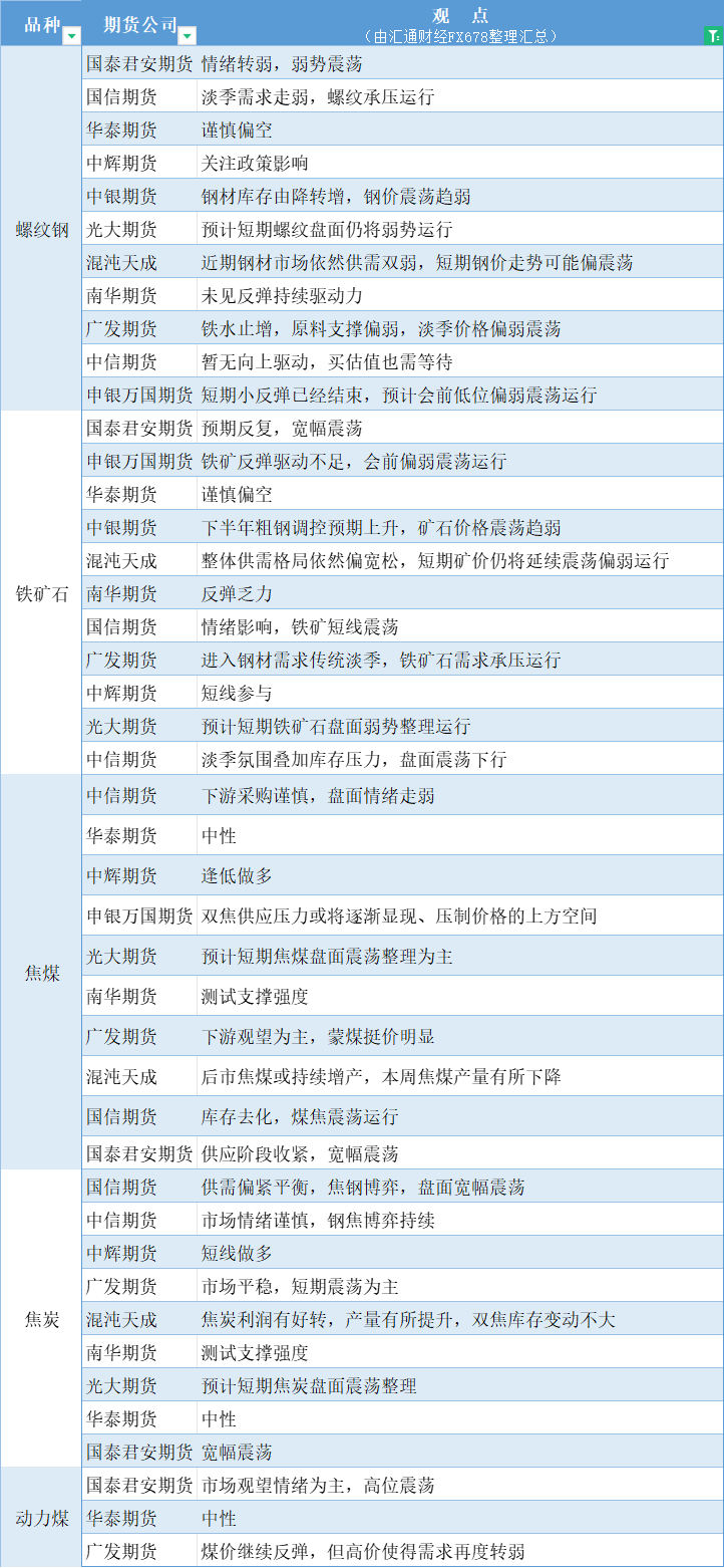 期货公司观点汇总一张图:7月12日黑色系(螺纹钢、焦煤、焦炭、铁矿石、动力煤等)