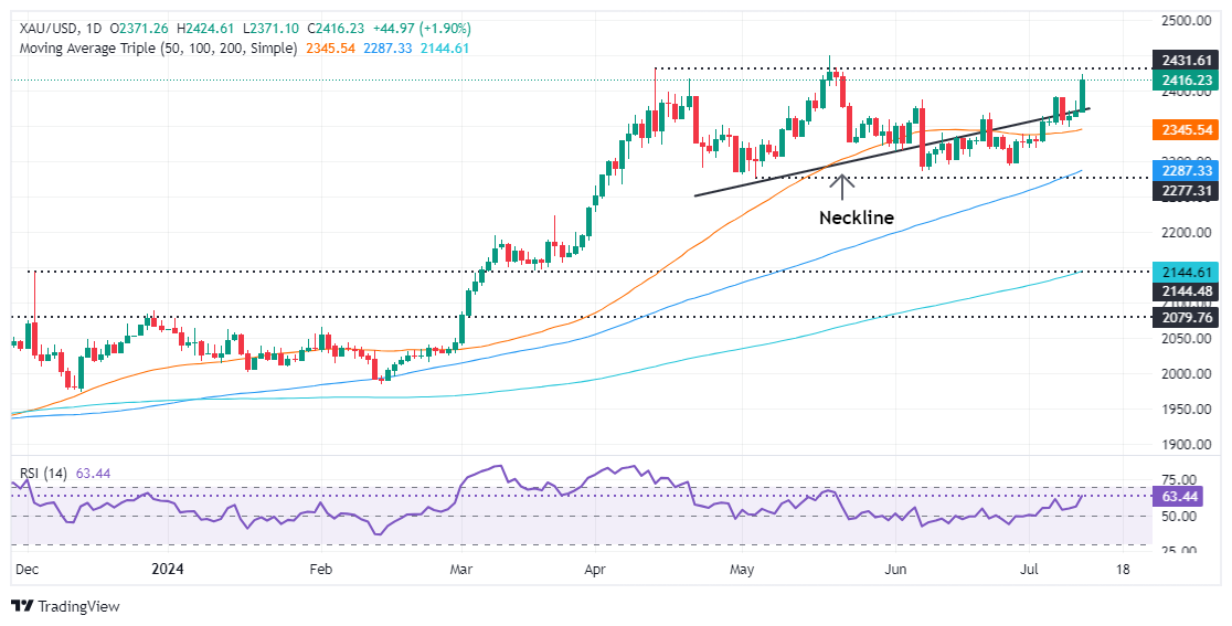现货黄金周四收盘暴涨44.18美元,涨幅1.86%,报2415.22美元/盎司;美国CPI数据出炉后,金价最高触及2424.57美元/盎司。