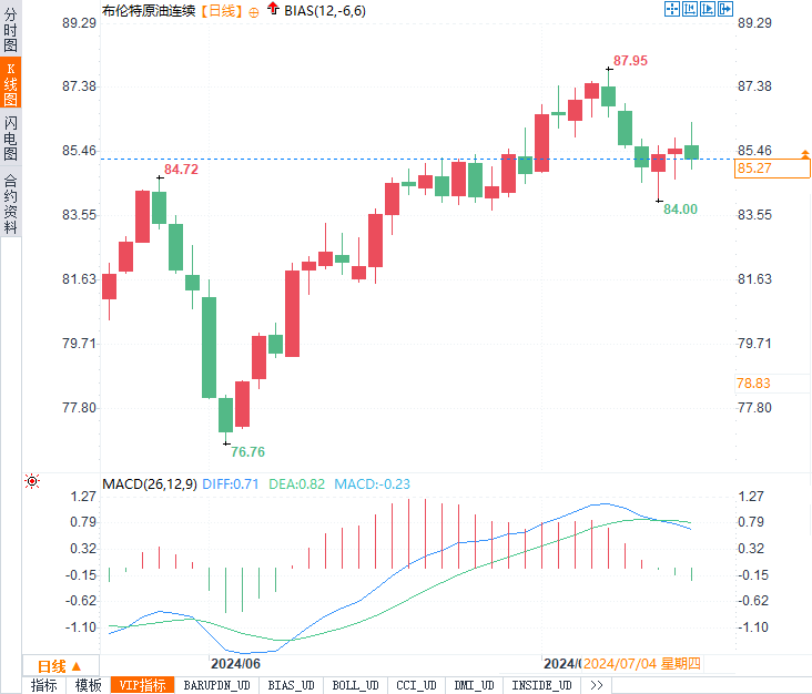 布伦特原油期货下跌0.37美元/桶,跌幅0.4%,收报85.03美元/桶,累计跌幅为1.7%。市场情绪受到了美国消费者信心疲软与对美联储9月降息希望增加的双重影响。