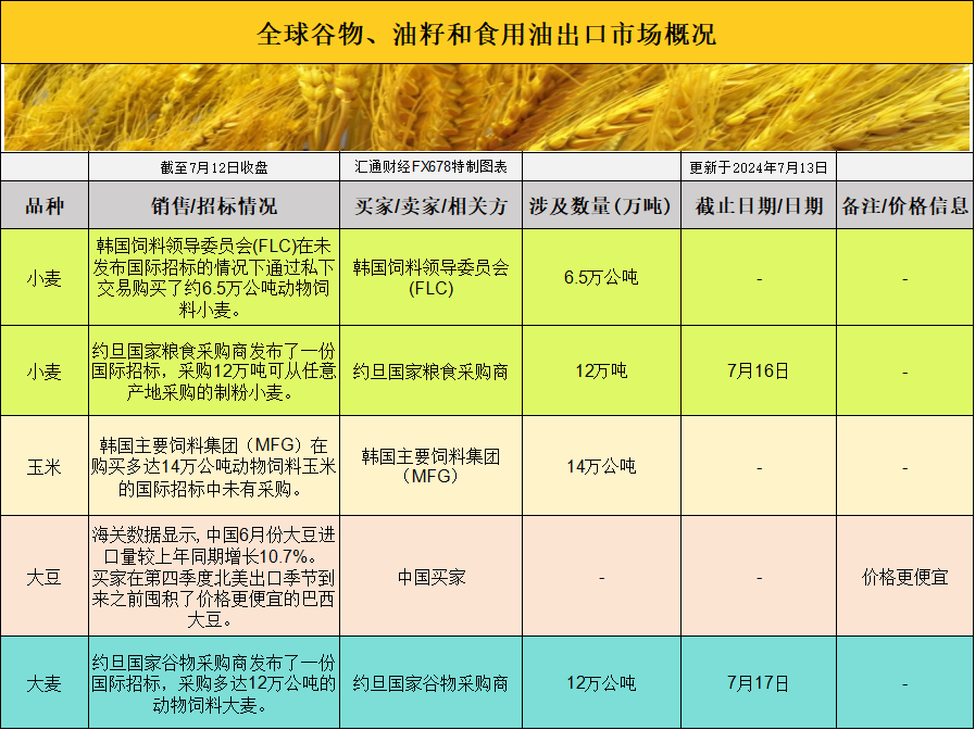 全球谷物、油籽和食用油出口市场招标、采购概况显示,欧洲贸易商称突尼斯国家谷物机构购买了约10万公吨软小麦和约5万公吨硬粒小麦。日本农林水产省(MAFF)在周三结束的定期招标中从美国、加拿大和澳大利亚购买了总计129,660公吨食用小麦。日本农林水产省(MAFF)表示,将通过7月10日举行的同步买卖(SBS)拍卖寻求6.5万吨饲料小麦和2.5万吨饲料大麦。