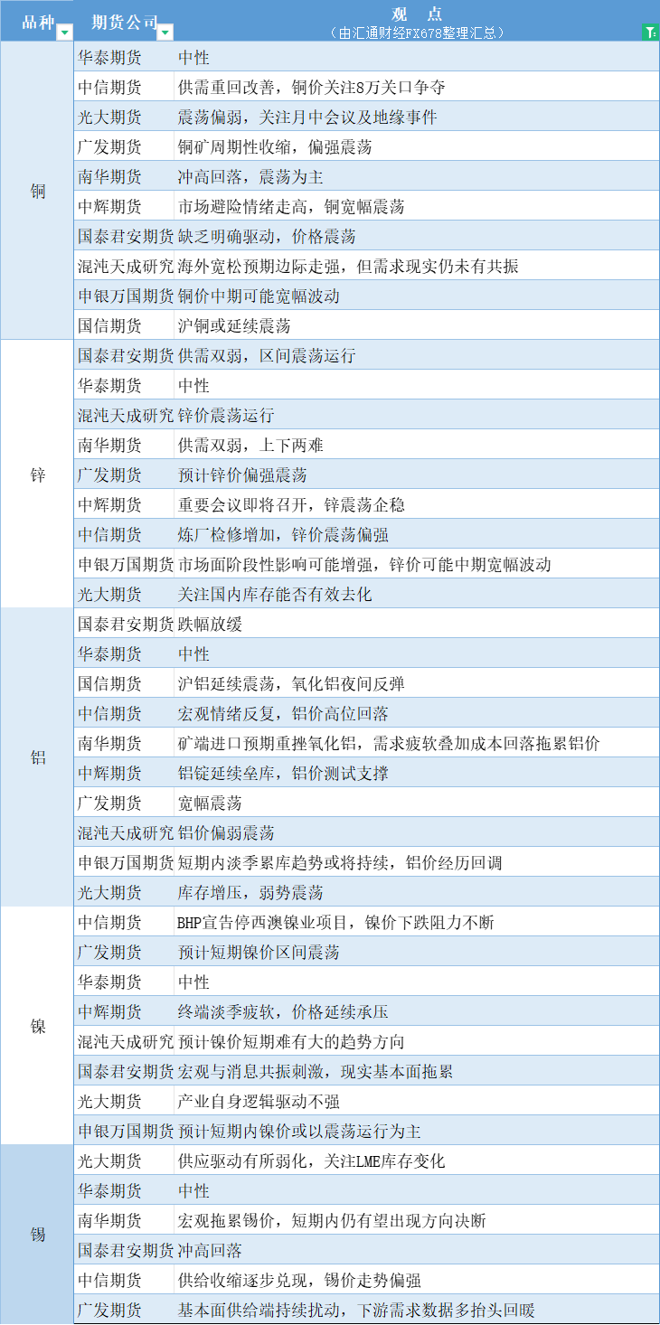 标题:期货公司观点汇总一张图:7月15日有色系(铜、锌、铝、镍、锡等)