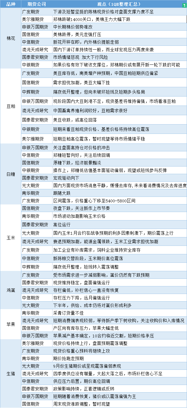 期货公司观点汇总一张图:9月26日农产品(棉花、豆粕、白糖、玉米、鸡蛋、生猪等)